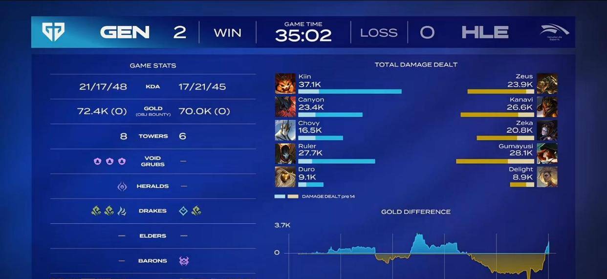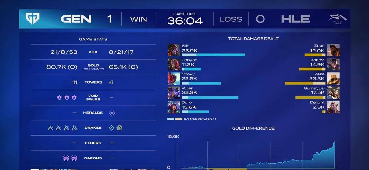 如果说第一局是被逆转,那么第二局的失利,则更像是一场漫长的“折磨”。HLE一度在经济和资源上都拥有相当可观的领先,甚至成功拿下大龙。许多观众或许已经认为HLE即将扳回一城。然而,电竞比赛最残酷也最迷人的地方就在于,水晶爆炸之前,一切皆有可能。GEN在这时展现出了他们令人惊叹的韧性,在比赛进行到35分钟时,通过一波堪称完美的团战,以0换4的战绩,完成了不可思议的绝地翻盘。那一刻,HLE队员耳机里弥漫的沉默,足以想象。从巨大的优势跌入突然的死亡,这种巨大的心理落差,足以摧毁任何一支队伍的信心。于是,在第三局的比赛中,我们看到的是一支早已失去灵魂的队伍,操作变形,决策失误,最终被GEN行云流水般地以3比0横扫。
